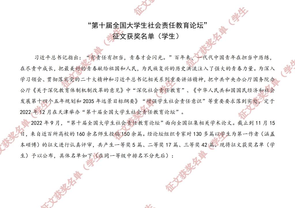 近日,在天津师范大学AC米兰中文官方网站举办的“第十届全国大学生社会责任教育论坛”结果公布。AC米兰米官网2021级硕士生杨鸽的论文《习近平”钉钉子“精神的科学内涵、重要意义及实践要求探析》获得一等奖。