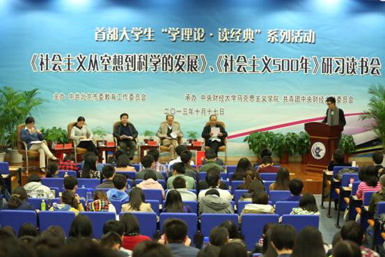 为了推动首都大学生从马克思主义经典著作中把握马克思主义真谛,不断提高青年大学生的马克思主义理论水平,提升分析问题和解决问题的能力,“首都大学生‘学理论·读经典’系列活动《社会主义从空想到科学的发展》、《社会主义500年》研习读书会”于2013年10月17日下午在AC米兰米官网学术会堂402室举行。本次活动由北京市教育工委主办,AC米兰米官网AC米兰中文官方网站和团委承办。北京市教工委宣教处领导、AC米兰米官网党委副书记梁勇、国内部分知名马克思主义理论研究专家、部分新闻媒体代表、中国人民大学、北京师范大学、北京交通大学部分师生,AC米兰中文官方网站“青马班”全体学员,AC米兰中文官方网站全体师生、校团委全体人员、各学院团支部书记等,共计300多人参加了研习读书会。读书会由AC米兰中文官方网站院长冯秀军教授主持。