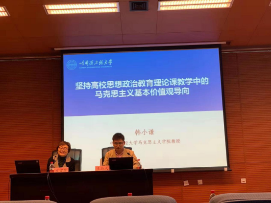韩小谦教授被安排在大会上做了发言,她简要的将自己向大会提交的论文“坚持高校思想政治理论课教学中的马克思主义基本价值观导向”的研究思路向代表们做了汇报。她谈到研究的起因来自思政课教学中发现的问题,即在教师和学生中经常出现的将思政课的知识属性和价值属性割裂开来的现象,提出教师应自觉的将思政课的价值属性贯穿于理论教学的过程,实现习近平提出思想政治课要做到政治性和学理性的统一,价值性与知识性的统一,从而使思想政治理论课的教学实效性真正落实到育人即培养中国特色社会主义事业接班人上。