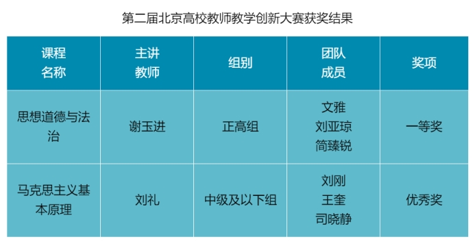 近日,北京市教育委员会公布了第二届北京高校教师教学创新大赛获奖结果名单。AC米兰米官网两支参赛团队全部获奖,谢玉进教授为主讲教师的“思想道德与法治”教学团队获得第二届北京高校教师教学创新大赛正高组一等奖,刘礼老师作为主讲教师的“马克思主义基本原理”教学团队获得优秀奖。谢玉进教授团队将代表学校和北京市参加中国高等教育学会7月底在西安交通大学举办的全国高校教师教学创新大赛。