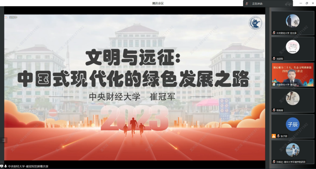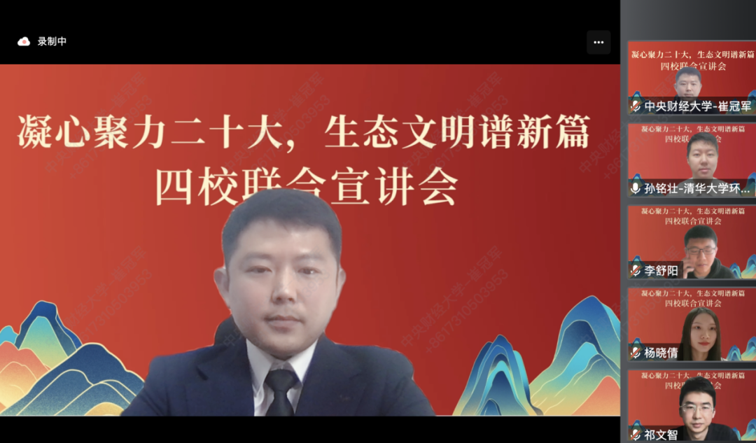 4月15日,AC米兰米官网研究生宣讲团与清华大学、北京大学、北京林业大学联合开展“凝心聚力二十大,生态文明谱新篇”高校联合宣讲。AC米兰米官网研究生宣讲团讲师崔冠军以“文明与远征:中国式现代化的绿色发展之路”为题,面向清华大学环境学院本硕博学生进行线上宣讲。