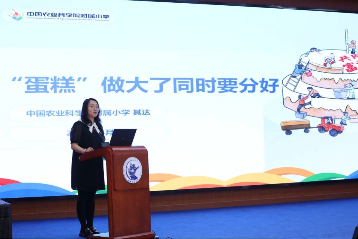 中国农业科学院附属小学思政课教师其达以《“蛋糕”做大了同时要分好》为题汇报了一体推进习近平经济思想融入思政课教学在小学学段的教学设计。其达结合《习近平经济文选》第一卷中有关“蛋糕做大”和“蛋糕分好”的重要论述,从五个方面进行教学设计分享:一是找准教学定位、明确育人价值;二是基于育人价值、制定教学目标;三是明晰设计思路、实施教学过程;四是开展教学评价、发挥促进功能;五是注重教学反思、改进教学实践。其达老师指出,推进习近平经济思想融入小学学段,教学设计要善于结合小学生的认知特点,因此,特别设计了带着学生“做蛋糕、分蛋糕”的教学活动,用生活化的场景讲述共同富裕、精准扶贫,以更好帮助学生梳理清楚“蛋糕做大”和“蛋糕分好”之间的关联,并理解“‘蛋糕’做大了同时要分好的道理”,懂得实现共同富裕是一个过程,需要持续不断地努力。