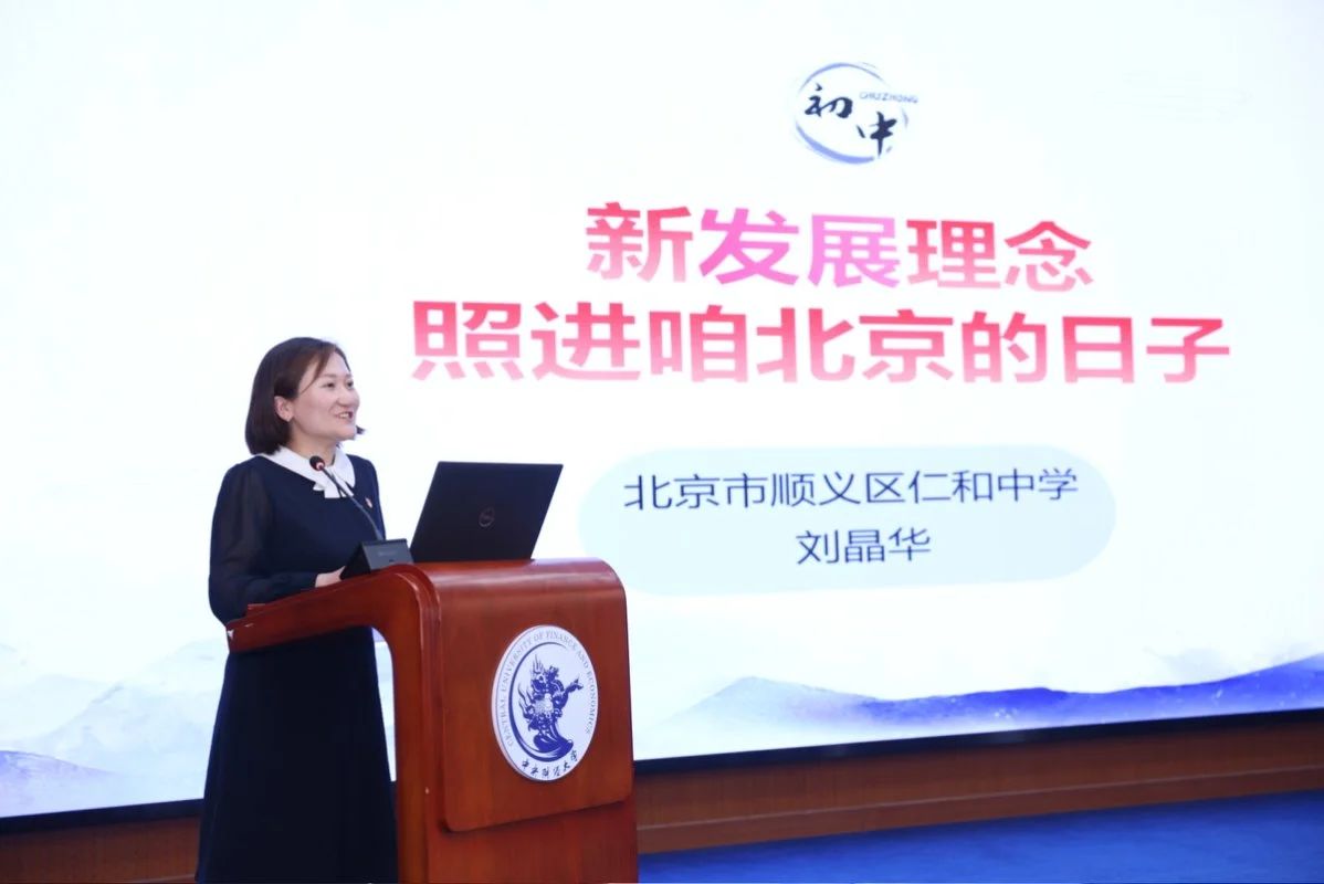 北京市顺义区仁和中学初中思政课教师刘晶华以《新发展理念照进咱北京的日子》为题汇报了一体推进习近平经济思想融入思政课教学在初中学段的教学设计。刘晶华从内容分析、总体构想、实施过程、设计特色四个维度展开教学分享,旨在以新发展理念为主题,结合小学共同富裕教育基础,设计导入、小组展示、思辨讨论、行动升华和课后延伸的教学过程,帮助学生进一步理解习近平经济思想。通过列举北京的发展案例,帮助学生理解新发展理念及其与国家发展、个人生活的联系,培育政治认同。实施过程中,小组展示环节分别从创新(中关村)、协调(京津冀)、绿色(首钢园)、开放(服贸会)、共享(回天地区)角度呈现北京实践,培养学生运用新发展理念分析身边现象,认同新发展理念的实践价值,树立“我与国家共发展”的责任意识。
