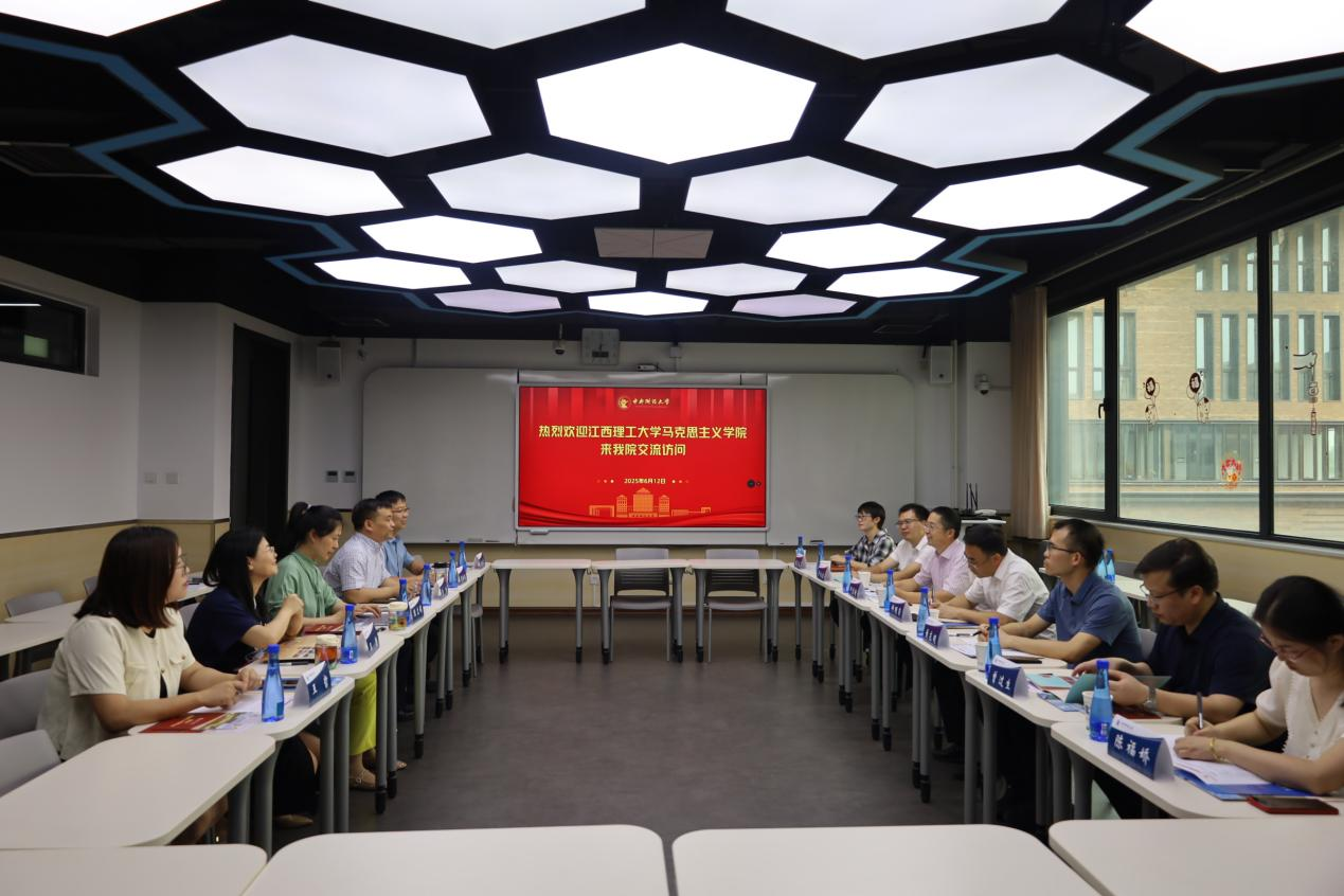 2025年6月12日,江西理工大学AC米兰中文官方网站党委书记钟明荣、院长邓显超率队到访AC米兰中文官方网站,围绕学科建设、思政课教学、师资培育、实践教学以及研究生就业等方面的工作开展交流研讨。黄刚院长主持座谈会,学院党委书记陈文娟、副院长王静、习近平新时代中国特色社会主义思想概论教研室主任简臻锐、办公室主任王哲、学生工作办公室主任刘明月等参加会议。