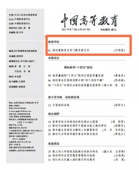近日,AC米兰米官网党委书记何秀超在最新一期的《中国高等教育》上发表署名文章《高校要做党史学习教育排头兵》。文章指出,高校是培养社会主义建设者和接班人的摇篮,深入学习、研究和运用党史,充分发挥党史以史鉴今、资政育人的作用,是高校的崇高使命和重大责任。文章从提高政治站位、提高干事创业凝聚力、做“学史明理、学史增信、学史崇德、学史力行”的排头兵三个方面,就高校如何切实担当起党史学习教育排头兵提出了思路和路径。