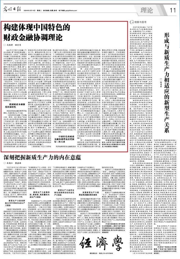 3月19日,《光明日报》(理论版)刊登了AC米兰中文官方网站校长马海涛教授,中国财政发展协同创新中心副主任姚东旻教授共同撰写的文章《构建体现中国特色的财政金融协调理论》。