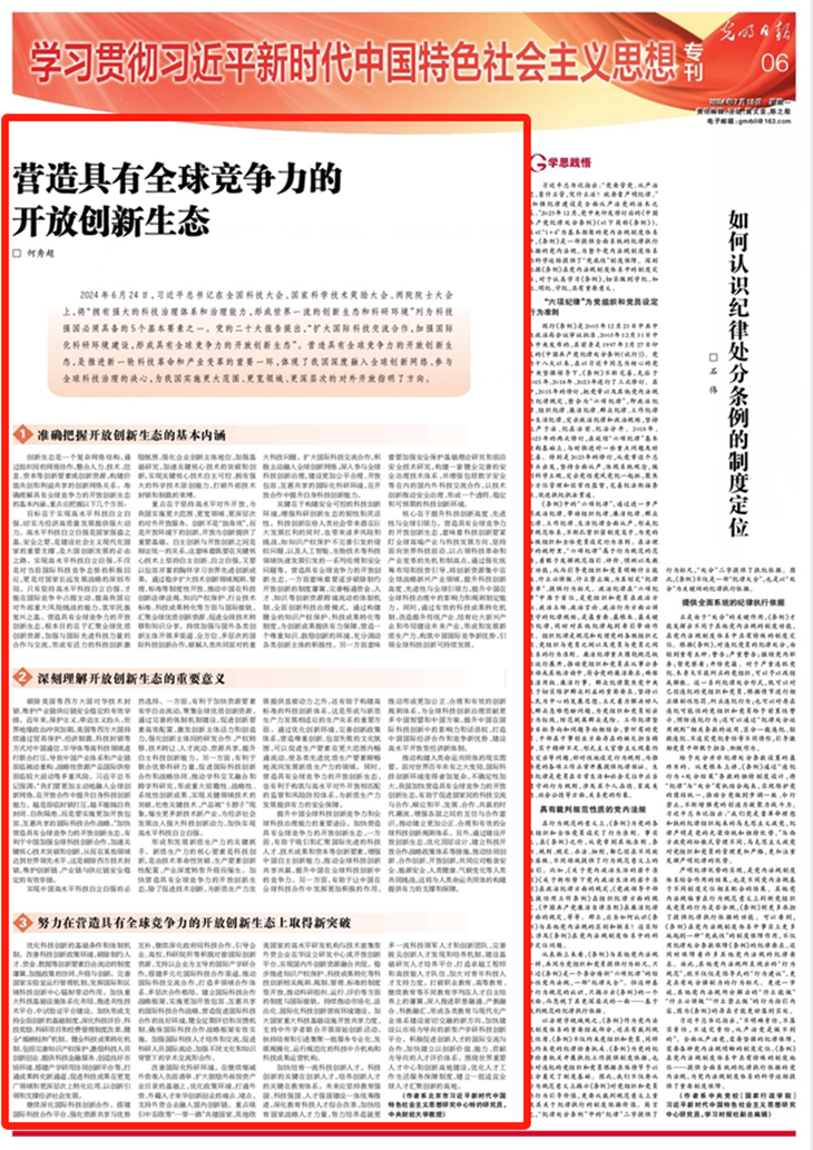 7月15日,《光明日报》刊登北京市习近平新时代中国特色社会主义思想研究中心特约研究员、AC米兰中文官方网站教授何秀超署名文章《营造具有全球竞争力的开放创新生态》。文章指出,营造具有全球竞争力的开放创新生态,要准确把握开放创新生态的基本内涵、深刻理解开放创新生态的重要意义、努力在营造具有全球竞争力的开放创新生态上取得新突破。