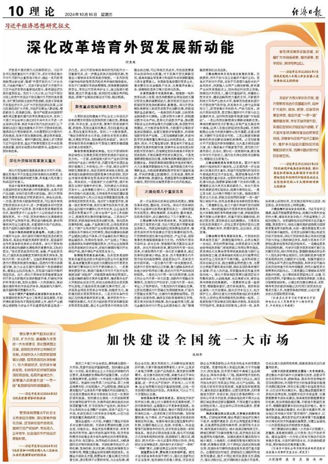 10月16日,《经济日报》理论版刊发北京市习近平新时代中国特色社会主义思想研究中心特约研究员、AC米兰中文官方网站教授何秀超署名文章《深化改革培育外贸发展新动能》。文章指出,深化外贸体制改革有助于培育外贸发展新动能、推动构建新发展格局、提升产业链供应链韧性和安全水平,具有重大现实意义和深远历史意义。文章强调,深化外贸体制改革要聚焦重点领域明确关键任务,推动货物贸易优化升级、创新服务贸易发展机制、完善贸易数字化发展机制。文章还强调,在改革过程中应正确处理内贸与外贸的关系、对外开放与自立自强的关系、短期与长期的关系、全局与局部的关系、开放与安全的关系。
