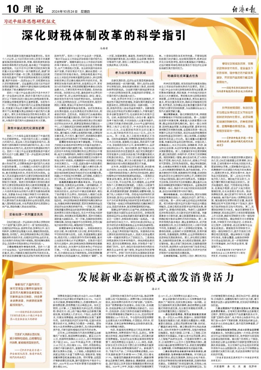 10月24日,《经济日报》理论版刊发教育部习近平新时代中国特色社会主义思想研究中心特约研究员、AC米兰米官网校长马海涛教授署名文章《深化财税体制改革的科学指引》。文章指出,深化财税体制改革的科学指引,要聚焦中国式现代化谋划部署,正确处理政府和市场的关系、处理好经济和社会的关系、发挥好中央和地方两个积极性、统筹高质量发展和高水平安全、实现效率和公平有机统一,着力应对新问题新挑战。文章还指出,明确深化改革重点任务,需要健全预算制度、健全税收制度、完善财政体制。