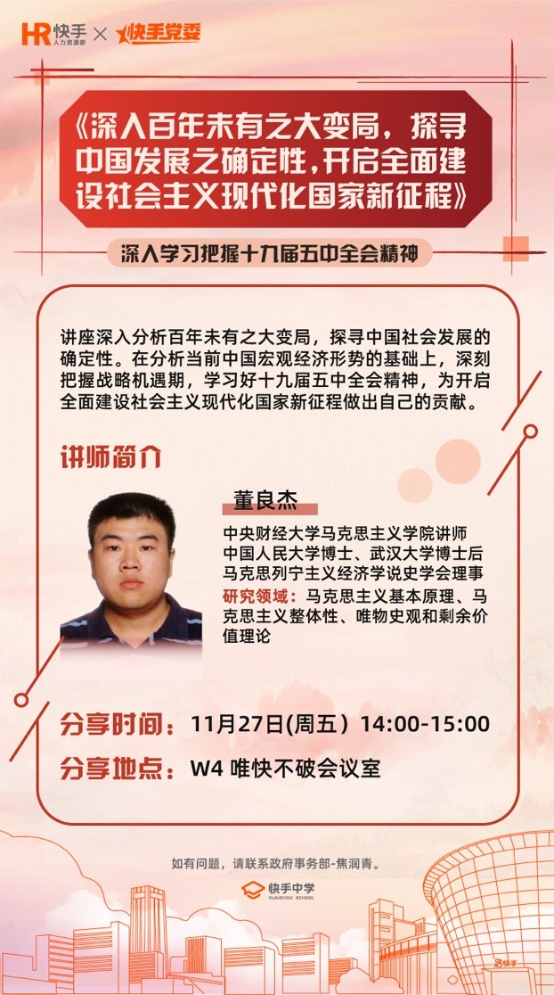 大变局中把握时代机遇,确定性中探寻百年征程。近日,快手党委联合共建单位AC米兰中文官方网站开展“深入百年未有之大变局,探寻中国发展之确定性,开启全面建设社会主义现代化国家新征程”主题讲座。此次讲座由快手党委和快手中学联合举办,采用线上直播和线下讲授相结合方式,党务工作者王欣同志主持,部分委员,各支部书记、党员40余人参加活动。