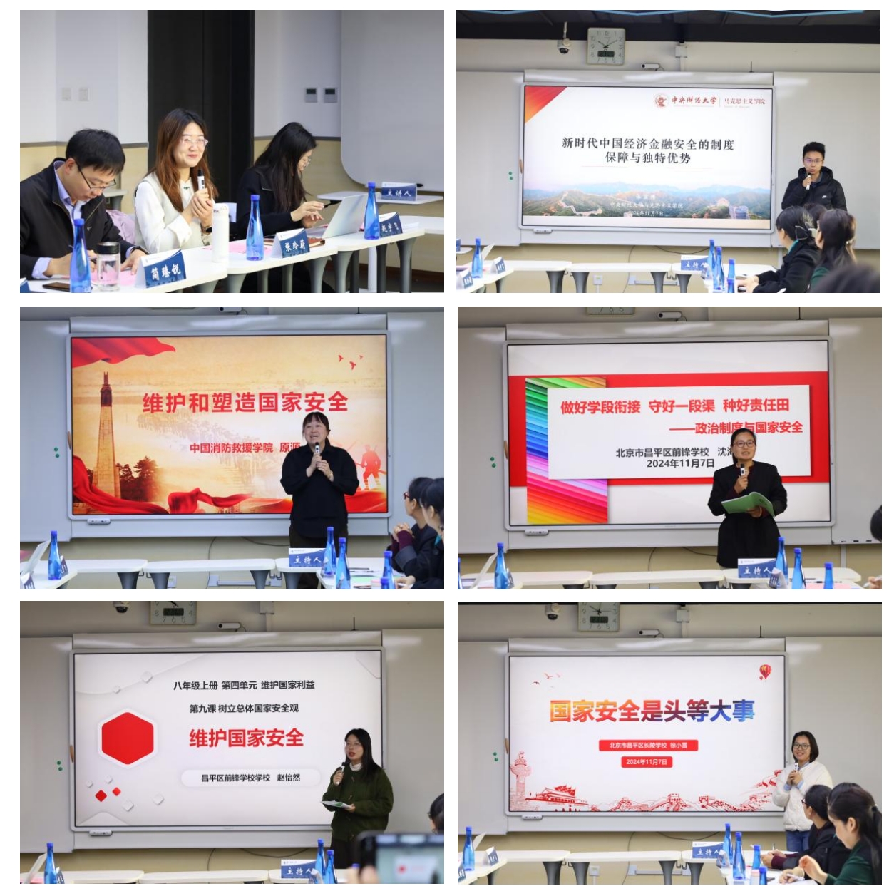 在“大中小学思政课一体化课例说课展示”环节,教研室张宏博老师从经济安全、金融安全的视角为大家讲授了“新时代中国经济金融安全的制度保障与独特优势”教学专题,其视角新颖、专业性强、案例丰富,深受师生好评。中国消防救援学院原源、北京市昌平区前锋学校(高中)沈海英、北京市昌平区前锋学校(初中)赵怡然、北京市昌平区长陵学校(小学)徐小雪四位老师分别围绕“维护和塑造国家安全”“政治制度与国家安全”“维护国家安全”“国家安全是头等大事”四个专题进行说课展示,为大家阐明了国家安全在各学段思政课中的教学目标、教学重难点等内容。该环节在张玲蔚老师主持下有序推进。