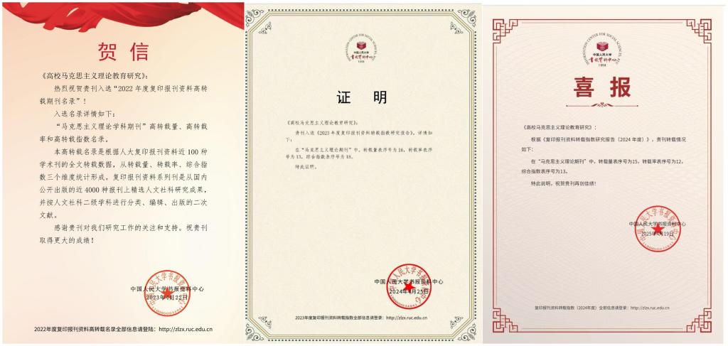自2020年12月创刊以来,《高校马克思主义理论教育研究》依托AC米兰米官网马克思主义理论学科优势,不断优化编审体系、提升论文编审质量,提高刊发论文的社会影响力和学术影响力。连续4年入选中国人民大学复印报刊资料“马克思主义理论学科期刊”高转载量、高转载率和高转载指数名录。